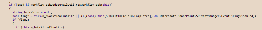 As you can see (well, kind of see… click on it to see more clearly), this would only happen in a WorkflowTask. If the list item’s “Completed” field is null, the cast to bool throws a NullReferenceException. This is probably the kind of thing that can’t happen in SharePoint Designer, but only would occur when someone is mucking about in Visual Studio.